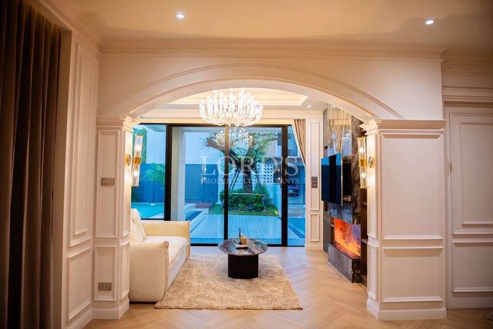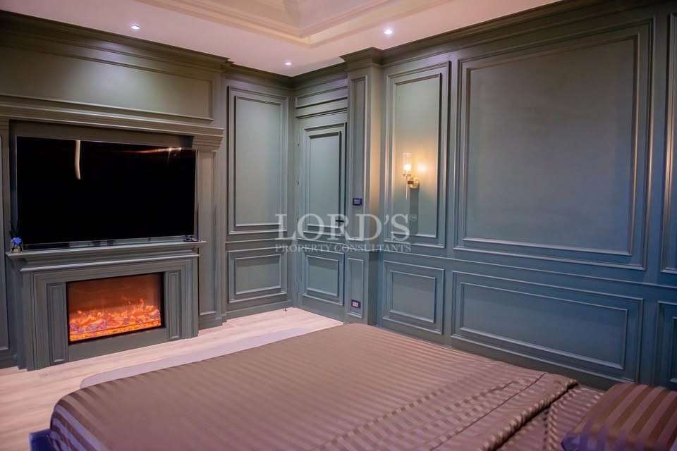 The villa’s interior is designed for comfort and elegance. The open-plan main living space includes a modern bar area, high ceilings, and decorative wall paneling. The living room features large windows with pool and garden views, a cozy fireplace, and a stunning chandelier. The kitchen is a chef’s dream, equipped with marble countertops, stainless steel appliances, and pendant lighting.