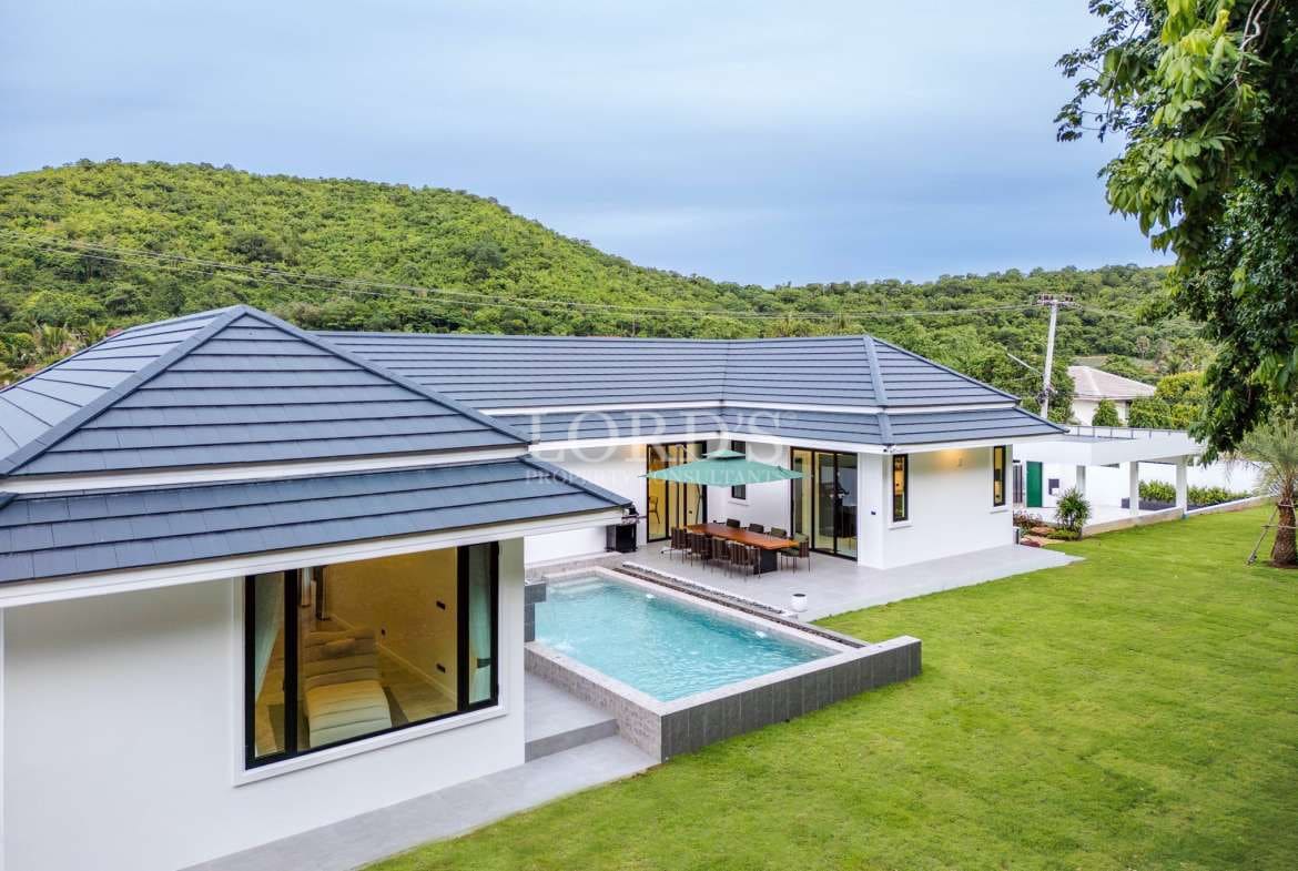 Stilvolle Villa mit 3 Schlafzimmern und 4 Bädern, privatem Salzwasserpool und Panoramablick auf die Berge, nur 15 Minuten von Hua Hin Stadt, Stränden, Bluport und Banyan Golf Club entfernt.