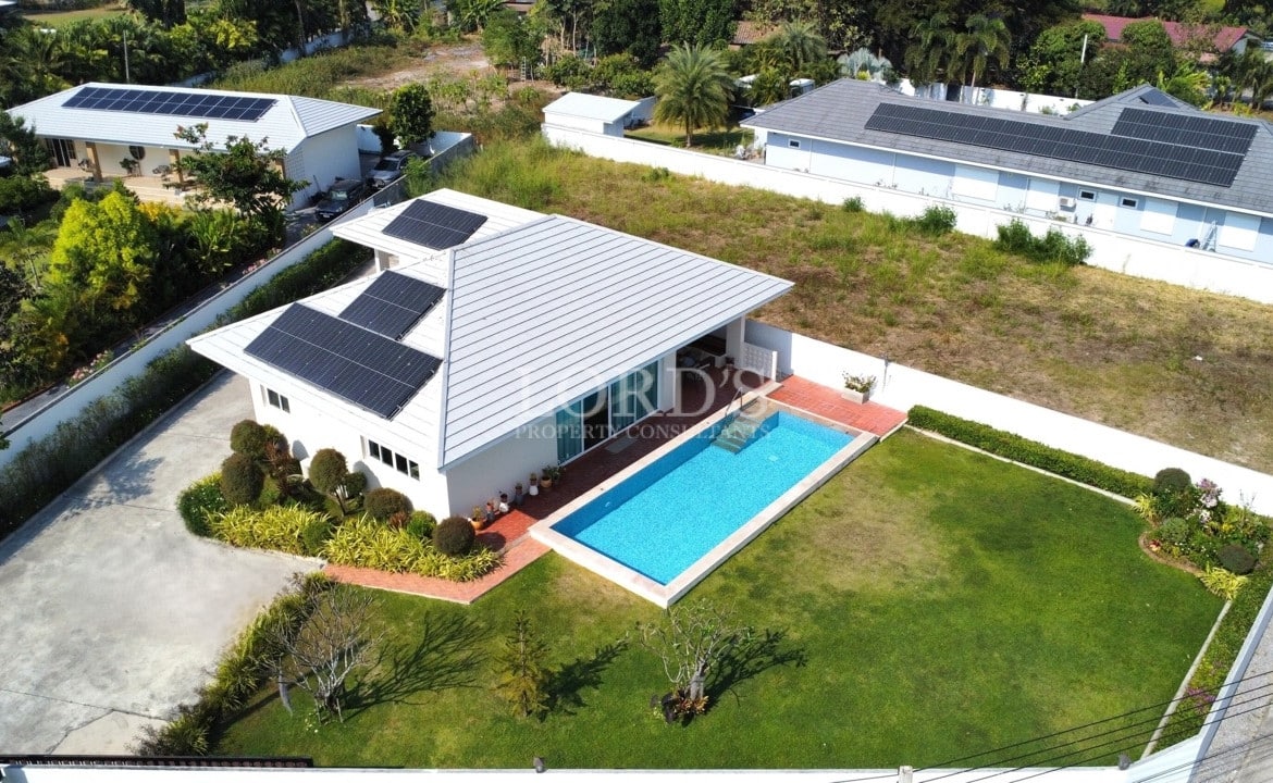 The home features a high-quality European kitchen, a private 10 x 4 meter swimming pool, and energy-efficient 7.2 kW solar panels. It comes with a Chanote title deed and has no common fees.
