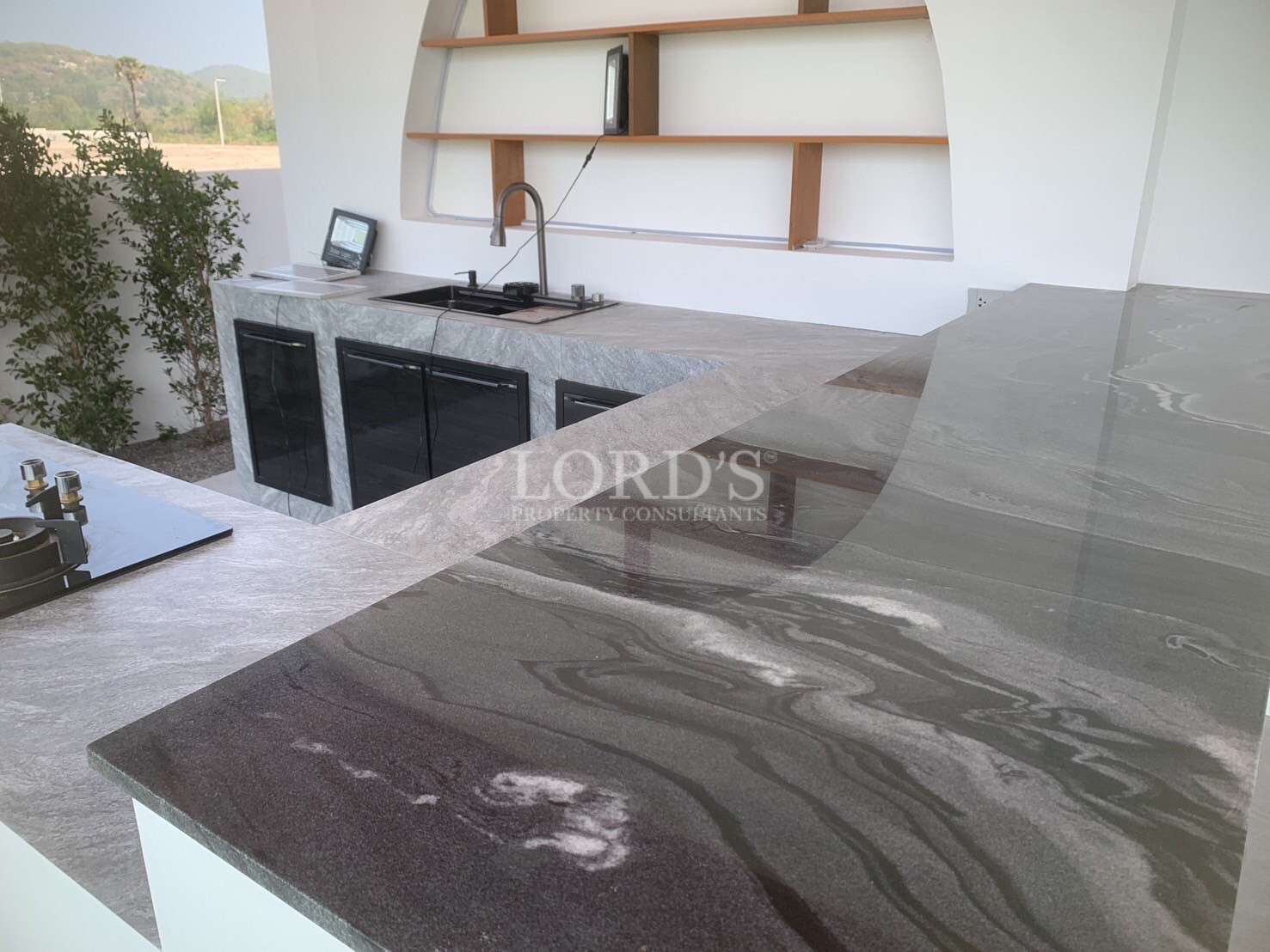 Expensive terrace with outdoor kitchen and bar, offering panoramic mountain views