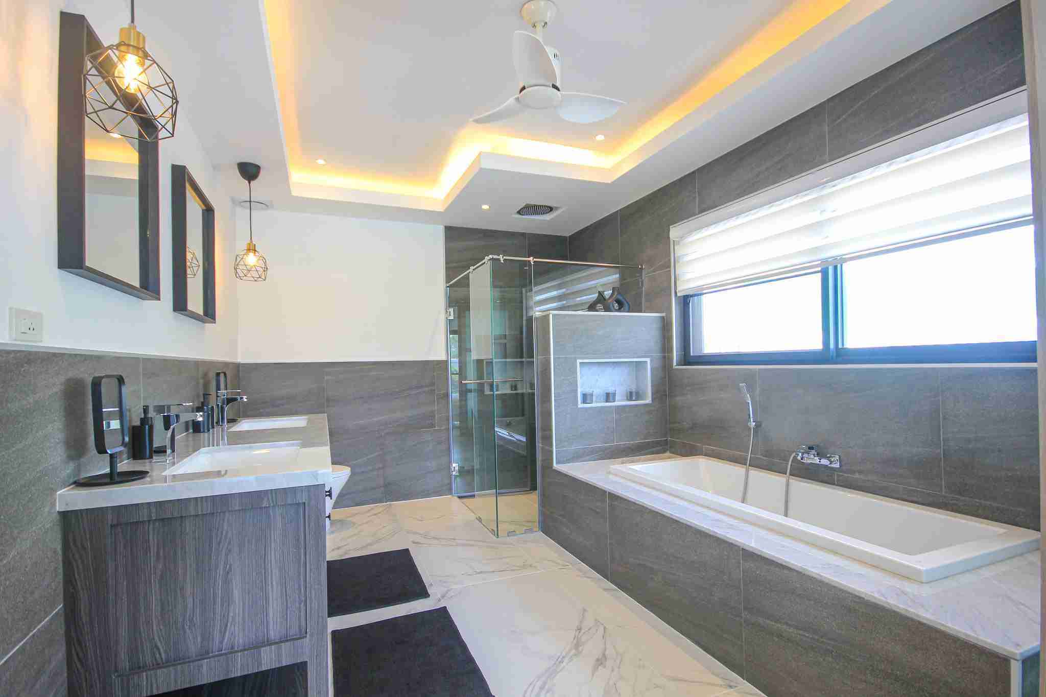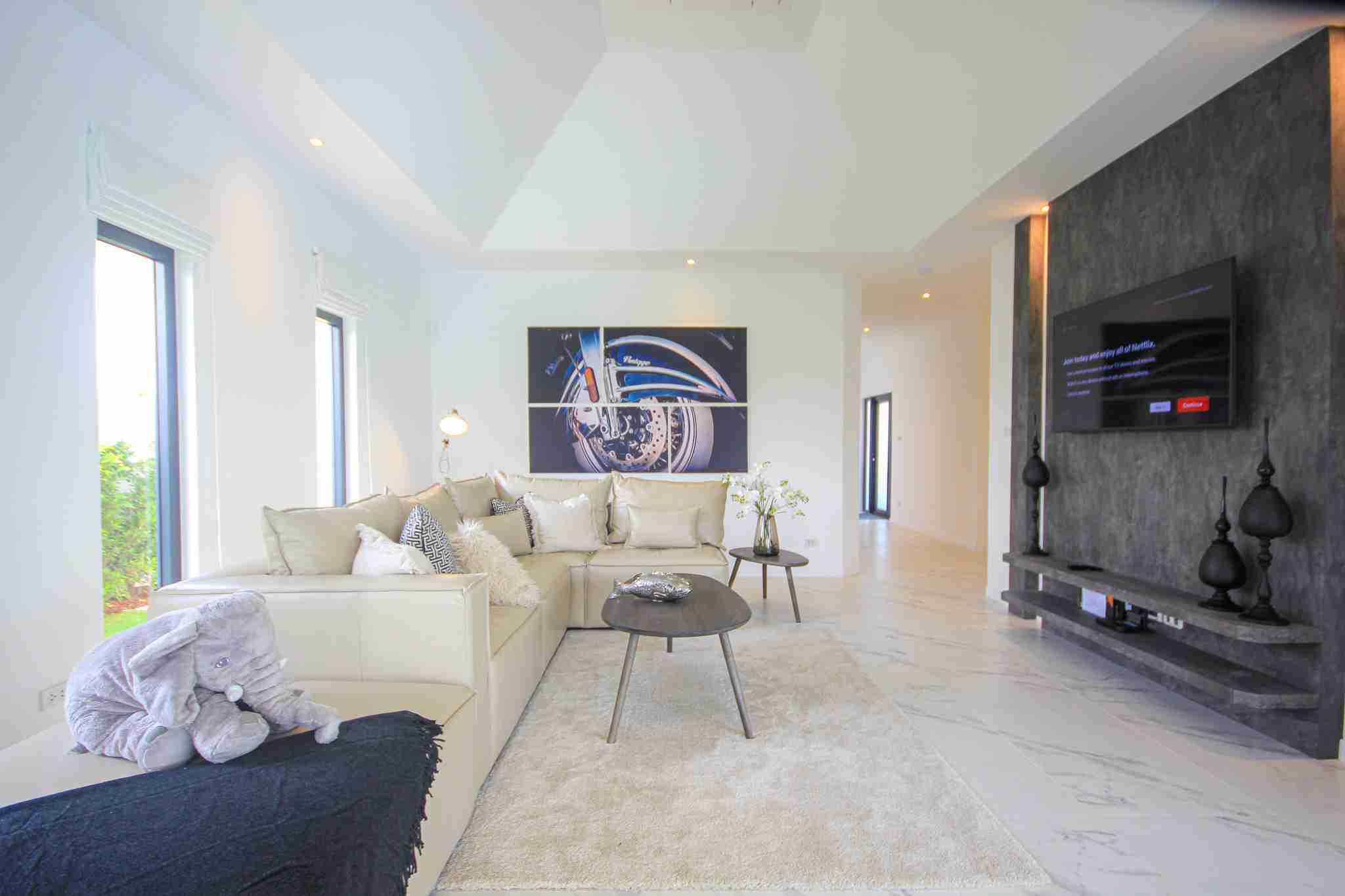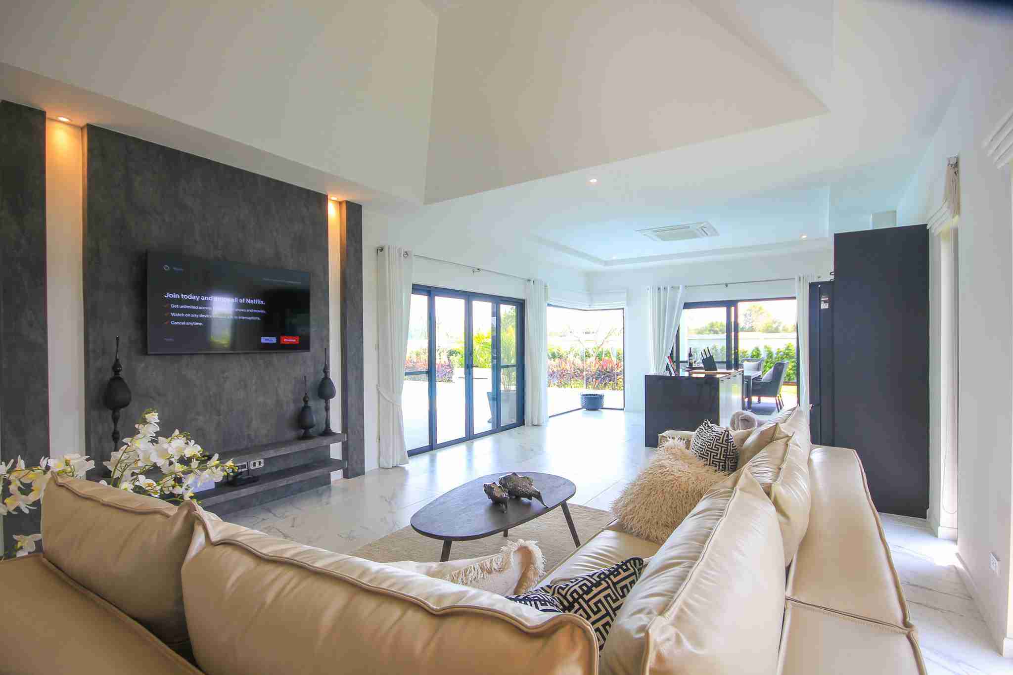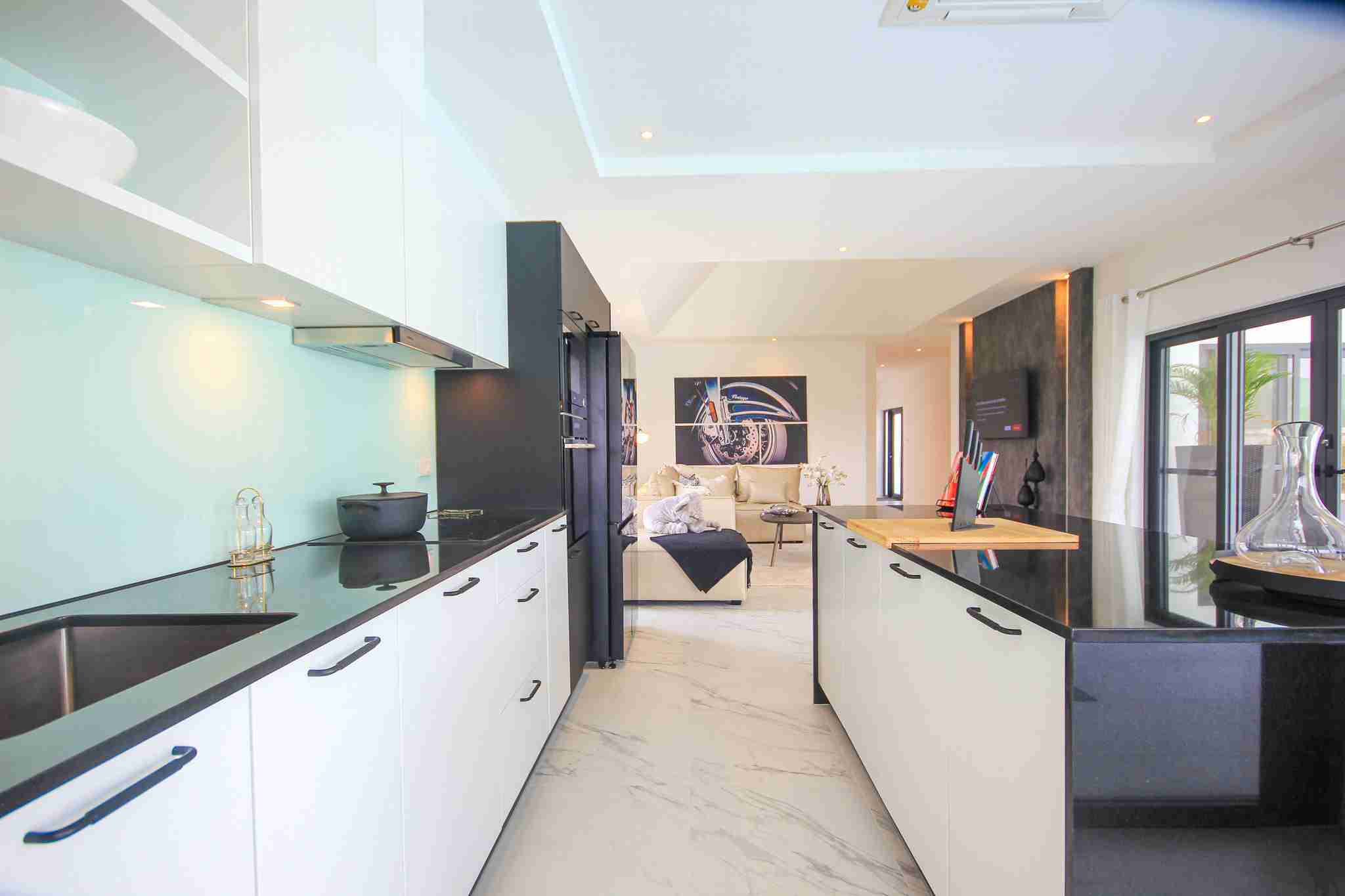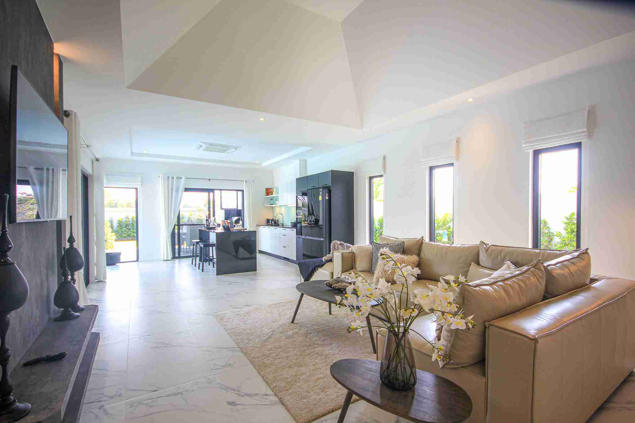 The Villa Leelawadee Plus is the biggest villa at 232 sqm. An open plan living room & kitchen with vaulted ceiling, make this vilal feel very spacious.
